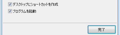 インストーラをダブルクリックしてインストールを行ってください。 完了画面で、「デスクトップにショートカットを作成」と「プログラムを起動」にチェックが入っていることを確認し「完了」ボタンを押します。 |