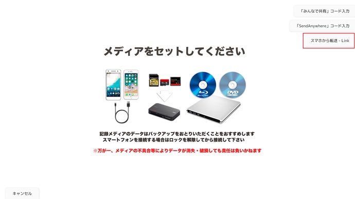 Linkを使ってデータ転送するには、Kioksのメディア待ち受け画面右上の『スマホから転送 - Link』を選択します。QRコードが表示されましたら、スマートフォンのカメラ(QRコードリーダー)等で読み取ってください。