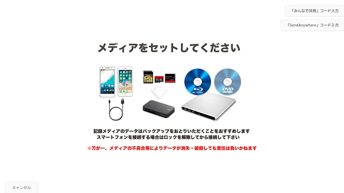 メディア受付画面が表示されますので、動画ファイルの入ったメディアをセットして、データを読み込んで下さい。
