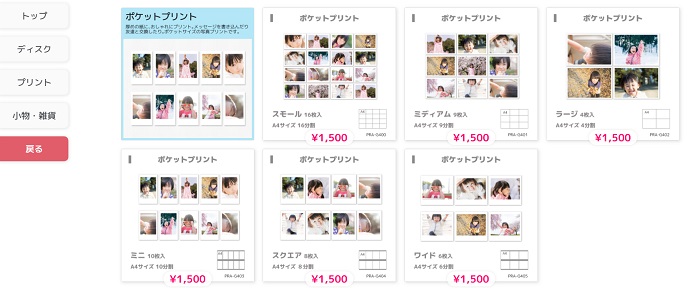 サイズの一覧が表示されますので、お好きなサイズを選択して下さい。選択できるサイズの取扱はお店によって異なります。ポケットプリントは複数枚のセットになっています。セット枚数はサイズによって異なりますのであらかじめご確認ください。
