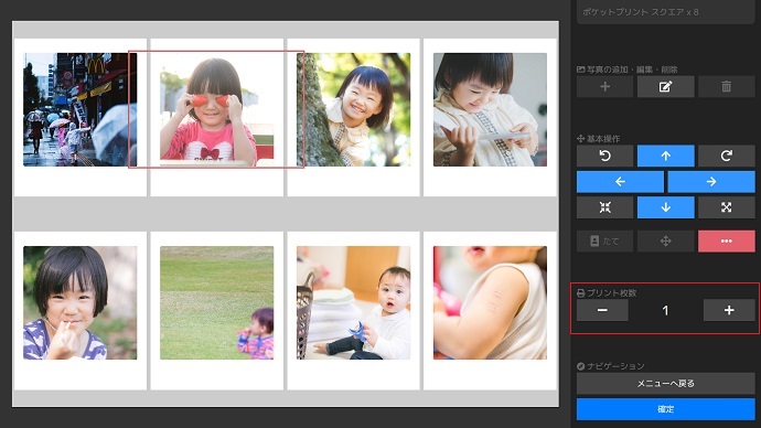 画面右下の『プリント枚数』で注文したい枚数を指定します。枚数の指定ができたら最後に『確定』ボタンを押してください。